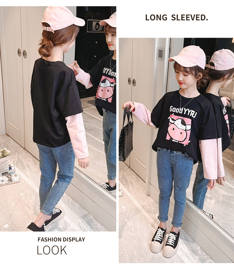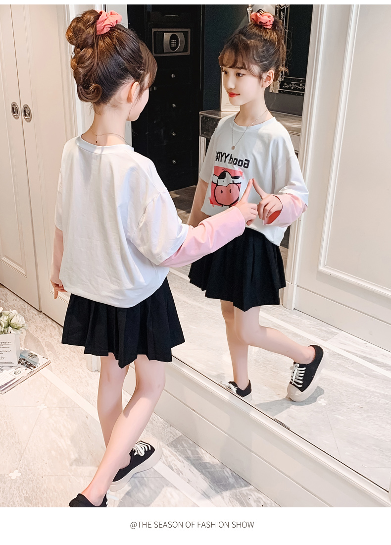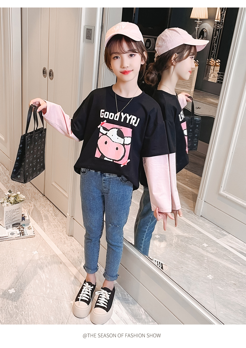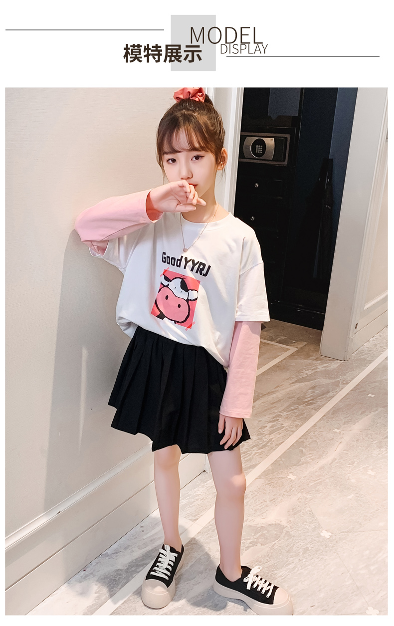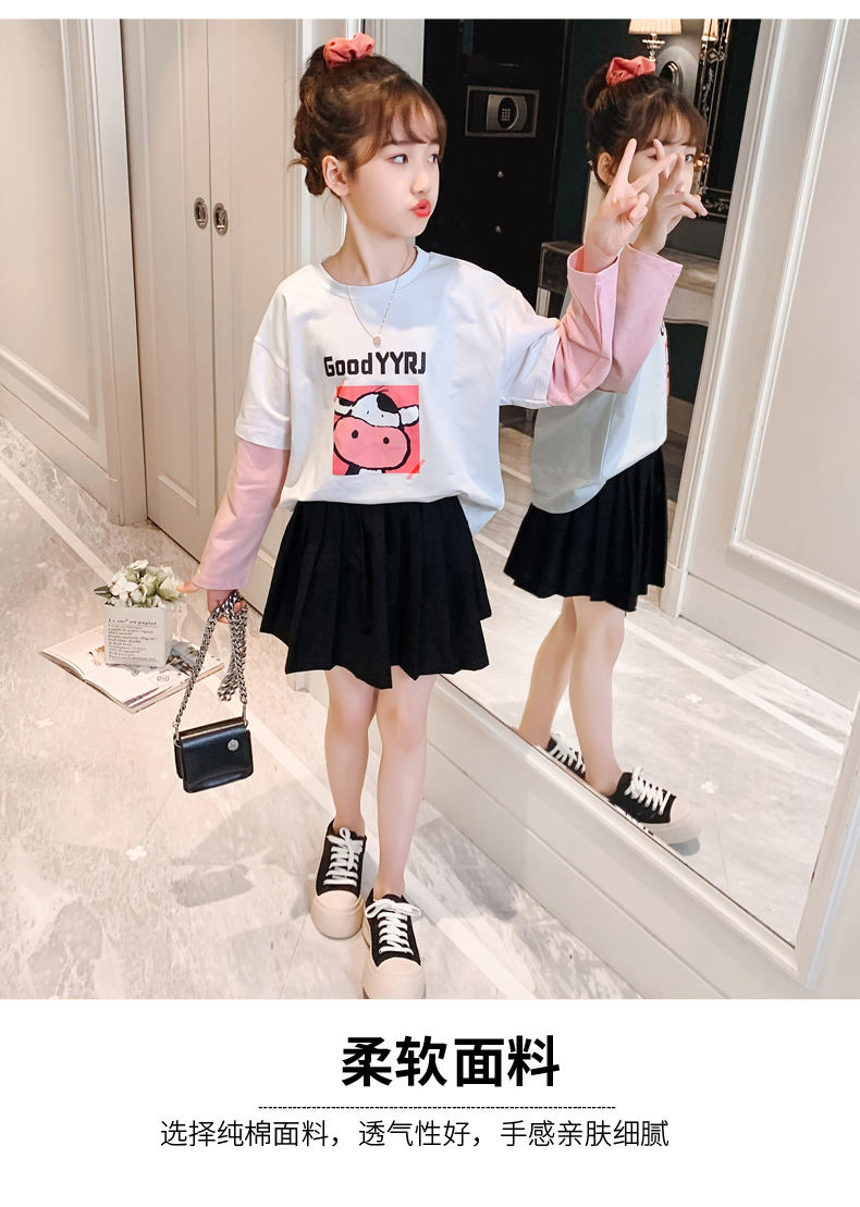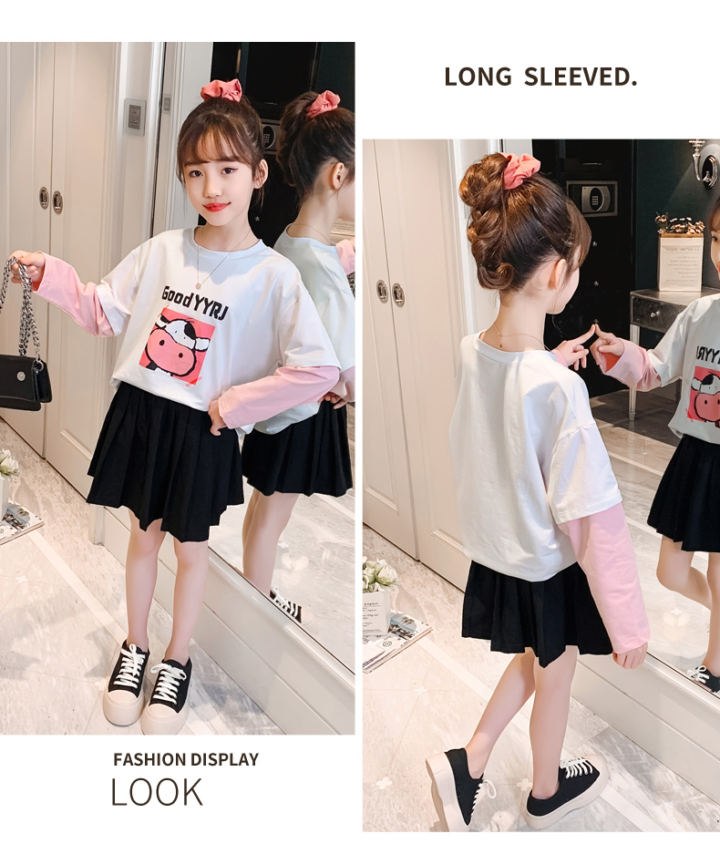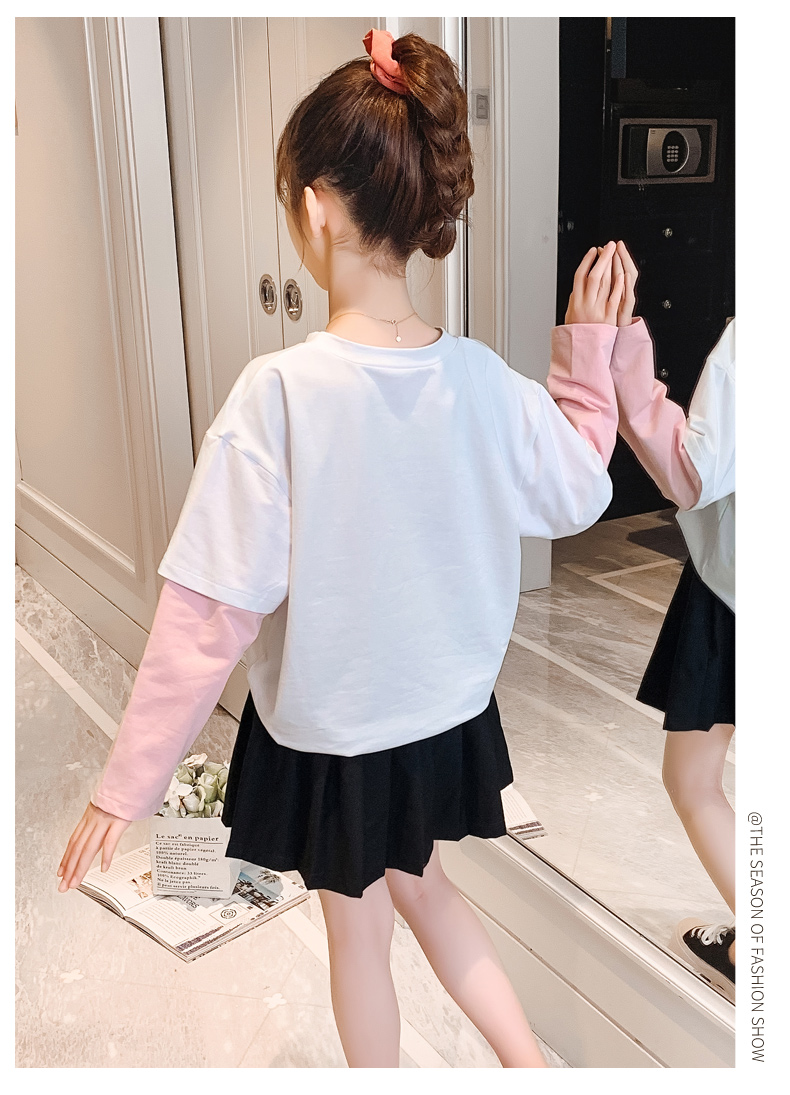 女童春夏2021新款洋氣潮流假兩件白色長袖T恤休閑時髦兒童上衣女